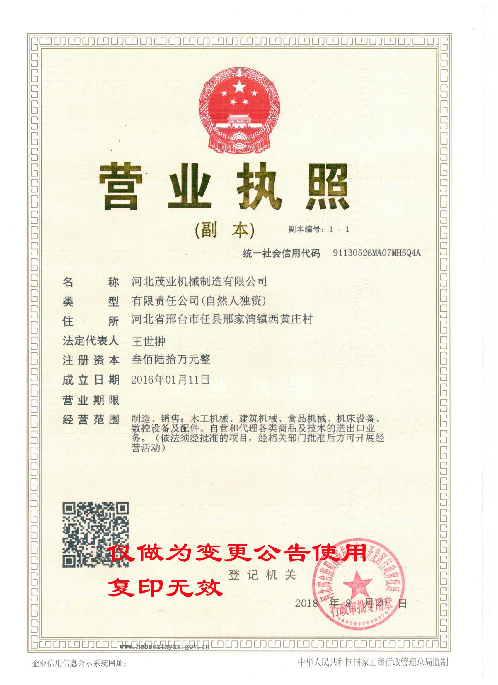 我司邢臺茂業(yè)機械制造有限公司,因公司業(yè)務發(fā)展的需要,現(xiàn)已整體變更為河北茂業(yè)機械制造有限公司,并于2018820日取得河北邢臺滏陽高新技術產(chǎn)業(yè)開發(fā)區(qū)審批局頒發(fā)的營業(yè)執(zhí)照。現(xiàn)將有關事項公告如下: